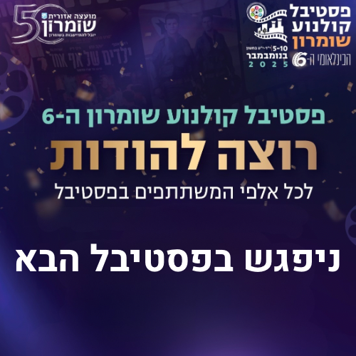 לרשימת הסרטים המלאה הקרנת טרום בכורה של הסרט "האחד והיחיד שלי" • טקס פתיחה בהנחיית שחקן הסרט, זהר שטראוס • הענקת אות מפעל חיים ליוצר והשחקן יהורם גאון • קוקטייל חגיגי פסטיבל קולנוע שומרון טקס הפתיחה רביעי | י"ד חשון |5.11.25 לפרטי האירוע הקרנה חגיגית של הסרטים האהובים "מבצע יהונתן" ו-קזבלן" מחווה ליוצר ולשחקן יהורם גאון רביעי | י"ד חשון |5.11.25 לפרטי האירוע הקרנת מיטב הסרטים של הקרן • שיחה עם יוצרים • קוקטייל חגיגי סרטי קרן קולנוע שומרון הקרנת בציר 2025 חמישי – ראשון |6-9.11.25 לפרטי האירוע סדנת AI בקולנוע • סדנת כתיבה • מפגשים ושיחות עם יוצרים בכל ימי הפסטיבל סדנאות קולנוע ומפגשי יוצרים רביעי – ראשון |5-9.11.25 לפרטי האירוע אירועים נוספים הקרנת סרטים קצרים ישראלים שעלו לגמר תחרות הפסטיבל • שיחה עם יוצרים • קוקטייל חגיגי הקרנת סרטים קצרים תחרות ישראלית ראשון | י"ח חשון |9.11.25 לפרטי האירוע הקרנת סרטים קצרים בינלאומיים שעלו לגמר תחרות הפסטיבל הקרנת סרטים קצרים תחרות בינלאומית ראשון | י"ח חשון |9.11.25 לפרטי האירוע יום מעשיר ומרתק למורי ותלמידי החמ"ד • הכרזה על הזוכים בתחרות • הקרנות סרטים • סדנאות ועוד תחרות פסטיבל קולנוע שומרון למגמות הקולנוע בחמ"ד חמישי | ט"ו חשון |6.11.25 לפרטי האירוע הקרנה חגיגית של סרטי הגמר של מגמת קולנוע וטלוויזיה הקרנת סרטי סטודנטים של אוניברסיטת אריאל ראשון | י"ח חשון |9.11.25 לפרטי האירוע אל תחמיצו צור קשר יש לכם שאלות נוספות? שם מלא אימייל טלפון הודעה שליחה